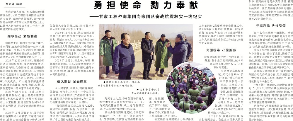 1月15日,《甘肃日报》第4版刊载《勇担使命 勠力贡献——甘肃OG真人官方集团专家团队奋战抗震救灾一线纪实》。该报道周全反由钏集团公司党委心系灾区、闻令而动的一系列继续作为务执行动,深度展现了专家团队和干部职工向险而行、甘于贡献的抗震救灾生动实践,进一步凝聚起奋力争取抗震救灾周全胜利的强鼎实力。