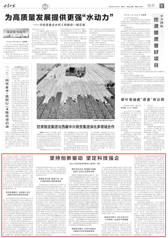 ¿Æ¼¼Á¢ÒìЧ¹ûÖØÔÚת»¯¡¢¹óÔÚÓ¦Ó᣸ÊËàOGÕæÈ˹ٷ½¼¯ÍżÈÓпÆÑÐÔºËùµÄÀúÊ·´«³Ð£¬ÓÖÓÐÌù½üÊг¡µÄÏÖʵÓÅÊÆ£¬ÔÚÍÆ½ø²úѧÑÐÓÃÒ»Ì廯ÉÏÈ¡µÃÁËÆð¾¢Ð§¹û¡£¼á³ÖÒÀÍÐÏîÄ¿¿ªÕ¹Á¢Ò죬ʡˮµçÉè¼ÆÔºÎª½â¾ö´óÐÍ×ê̽װ±¸½ø³¡ÊÜÏÞÄÑÌ⣬Ñз¢YG¡ª35CÐÍȫҺѹ¿É²ðжÇáÓ¯ÐͶàÓÃ;¹¤³Ì×ê»ú£¬¼´½«½øÈëÉú²ú½×¶Î¡£¸ÊËàÍÁľ½³³ÌÔºÎ§ÈÆÂÌÉ«½¨²ÄÑз¢ºÍ¹Å°å½¨²Ä¸ßЧʹÓã¬Ñз¢³ö´ó×Úúí·Ê¯×ÊÔ´»¯¿ª·¢¸ß»îÐÔÉú̬½ºÄýÖÊÁÏÊÖÒÕ£¬ÊµÏÖ½¨²ÄÉú²úÀú³Ì½ÚÄܼõÅźͲúÆ·µÍÄܺġ£¼á³Ö¿ª·ÅÏàÖú¿ªÕ¹Á¢Ò죬ÉÓëÊ¡ÄÚÍâ×ÅÃû¸ßУ¡¢¿ÆÑÐÔºËù¡¢´óÐÍÆóÒµµÄÏàÖú£¬Ê¡ÐÞ½¨Éè¼ÆÔºÓëÎ÷°²½»Í¨´óѧÏàÖú¡°ÐæÂäÕñÐËÓëÉç»áÉú̬ÈÍÐÔÊÓ½ÇÏÂÎ÷±±¹Å°åÐæÂäµÄ±£»¤ÓëÔÙÉúʹÓ᱿ÆÑÐÏîÄ¿£¬ÒÔ¸ÊËà¹Å°åÐæÂäΪÑо¿¹¤¾ß£¬Îªº£ÄÚÏàËÆµØÇøµÄ¹Å°åÐæÂä±£»¤ÓëÔÙÉúʹÓÃÌá³öÀíÂÛÒÀ¾ÝºÍÊÖÒÕÖ§³Ö£»Ê¡Ë®µçÉè¼ÆÔºÓëºÓº£´óѧÏàÖú¡°Î÷±±ÄÚ½ºÓÏÂÓμ°Î²ã̺þ²´Éú̬ˮÁ¿Óëµ÷Àí°ü¹ÜÒªº¦ÊÖÒÕ¡±¿ÆÑÐÏîÄ¿£¬¶ÔʯÑòºÓÁ÷Óò¾¼ÃÉç»áºÍÉú̬ÓÃË®¡¢Éú̬±£»¤¡¢ºÓºþÉú̬ËÕÐÑÌá³öºÏÀí»¯²½·¥½¨Ò飬֧³ÖÏÂÓÎ×ÔȻֲ±»ÁýÕֶȺÍÃæ»ýÀ©´ó5%ÒÔÉÏ£»¸ÊËàÍÁľ½³³ÌÔºÓë¶Ø»ÍÑо¿ÔºÏàÖú¿ª·¢µÄÑÒÍÁÖÊÎÄÎïÐÞ¸´ÖÊÁÏ£¬Ìî²¹ÁËÎÒ¹úÎÄÎïÐÞ¸´ÖÊÁÏ¿Õȱ¡£¼á³ÖÒÀÀµÆ½Ì¨¿ªÕ¹Á¢Ò죬·Å´óÉÏÊй«Ë¾×ÊÔ´¹¦Ð§£¬ÕÙļ7.6ÒÚÔª½¨ÉèÎ÷±±×î´óµÄ¹¤³Ì¼ì²âÑз¢ÖÐÐÄ£¬×öÇ¿×ö´ó×öÓżì²âÄ¥Á·ÓªÒµ£¬Òý½øº£ÄÚÒ»Á÷¼ì²âÄ¥Á·»ú¹¹ºÍʵÑéÊÒ£¬·¢¶¯ÌáÉýÑз¢ºÍÁ¢ÒìÄÜÁ¦£¬ÓªÒµ¼¯³É¡¢ÊÔÑéÑз¢¡¢ÐÂÓªÒµÅàÓýµÈ¹¤ÒµÐͬÉú³¤»ýºñ³ÉÊÆ¡£