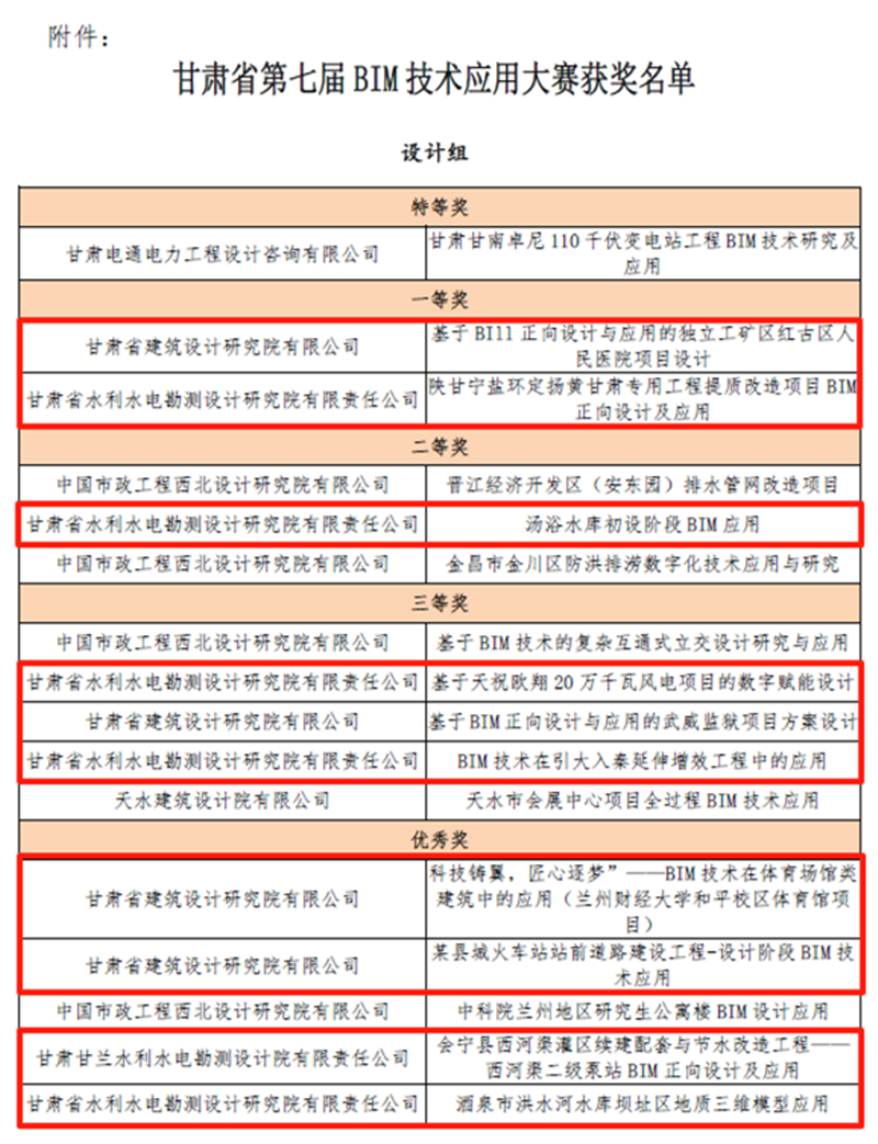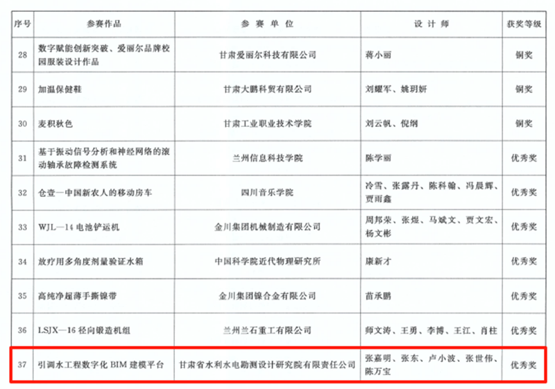 在甘肃省第七届BIM手艺应用大赛中,修建设计院、水电设计院报送的项目共斩获12项奖励,包办了设计组16个奖项中的10项。在甘肃省第五届“立异杯”工业设计大赛中,水电设计院《引调水工程数字化BIM建模平台》项目获优异奖。在第十七届全省职工优异手艺立异效果奖中,水电设计院、土木匠程院申报的两个项目分获立异效果奖三等奖,其中,《弃渣场三维设计平台》项目是全省水利系统唯一获奖效果。