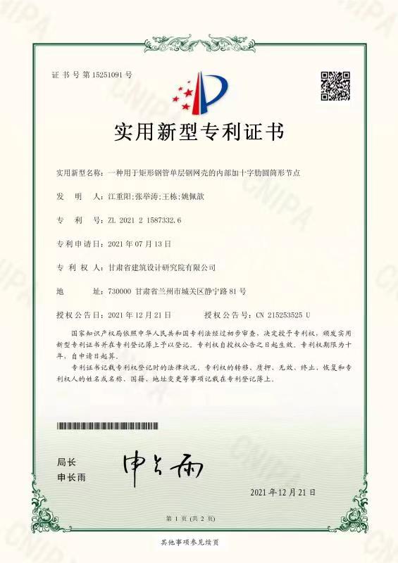 克日,从国家知识产权局传来好新闻,由修建设计院总工程师张举涛、设计四所总工程师江重阳、设计五院总工程师王栋、设计四所工程师姚佩歆团结申报的“一种用于矩形钢管单层钢网壳的内部加十字肋圆筒形节点”手艺,喜获国家适用新型专利。