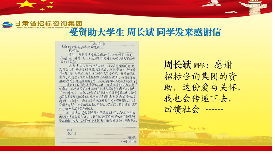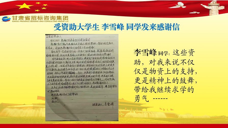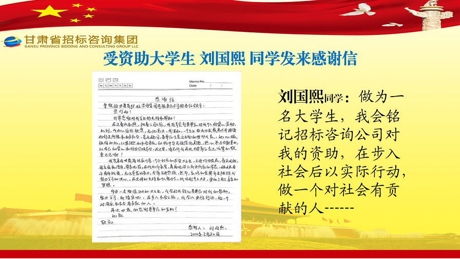 克日,张家川县张棉驿乡张棉村贫困大学生代表刘国熙、周长斌、李雪峰等向甘肃省招标咨询集团有限责任公司发来谢谢信,就招标咨询集团给予学费资助一事表达他们的谢谢之情。
