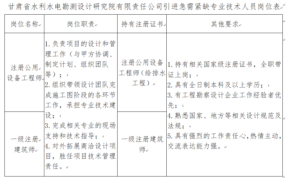 本次引进的详细岗位及资格条件详见《甘肃省水利水电勘探设计研究院有限责任公司引进急需紧缺专业手艺职员岗位表》(附件1)。