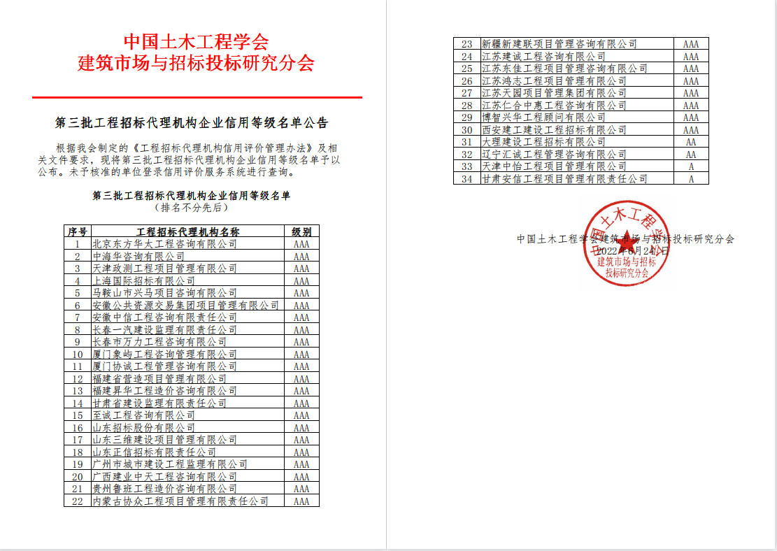 为认真贯彻落实甘肃省第十四次党代会精神,更好地生长招标署理营业,起劲推进企业高质量生长,2022年6月,甘肃省建设监理有限责任公司起劲准备加入了由中领土木匠程学会修建市场与招投标研究分会组织的招标署理机构信用评价,日前,第三批工程招标署理机构企业信用品级名单宣布,建设监理公司荣获中领土木匠程学会修建市场与招标投标研究分会招标署理机构AAA级信用企业称呼。