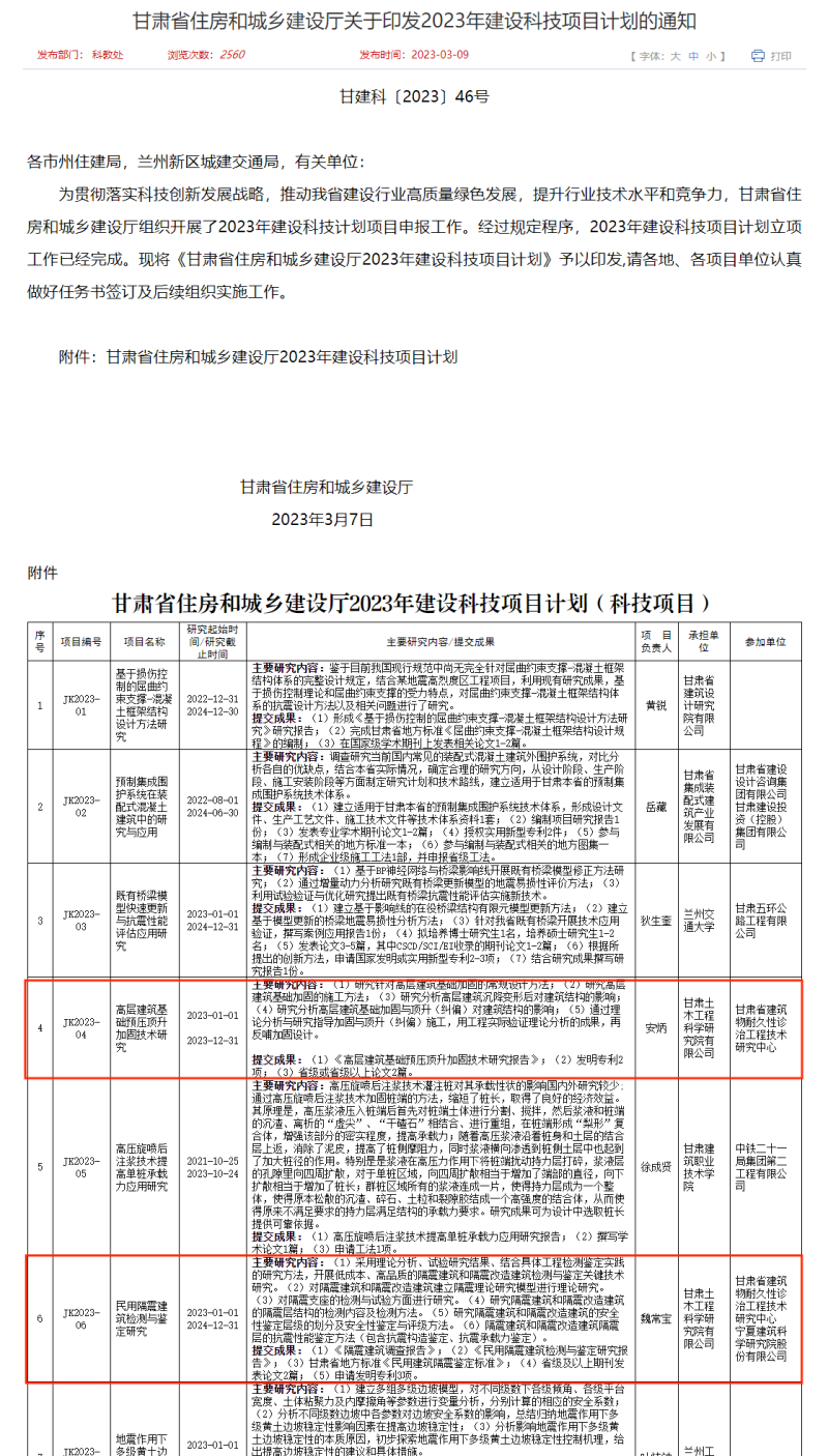 克日 ,从《甘肃省住房和城乡建设厅关于印发2023年建设科技项目妄想的通知》(甘建科〔2023〕46号)获悉 ,由土木匠程院组织申报的两项科技攻关项目《高层修建基础预压顶升加固手艺研究》(立项编号JK2023-03)、民用隔震修建检测与判断研究(立项编号JK2023-06)和两项软课题《2022-2023年度甘肃省民用修建能耗统计数据剖析与研究》(立项编号JK2023-45)、《2022年度甘肃省修建能耗监测平台的能耗数据剖析与研究》(立项编号JK2023-46)乐成获批立项。