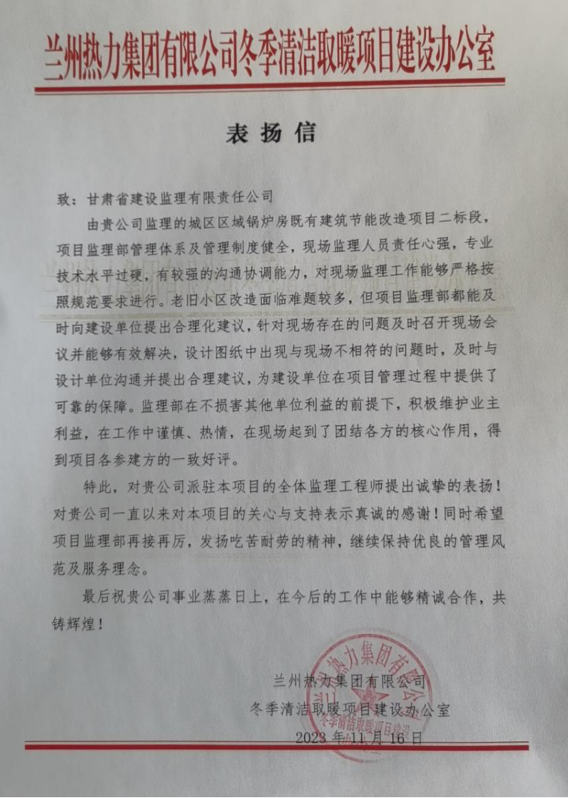 克日,省建设监理公司收到兰州热力集团有限公司冬季清洁取暖和项目建设办公室发来的表扬信,对省建设监理公司城戋戋域锅炉房既有修建节能刷新项目二标段监理部全体职员体现谢谢。