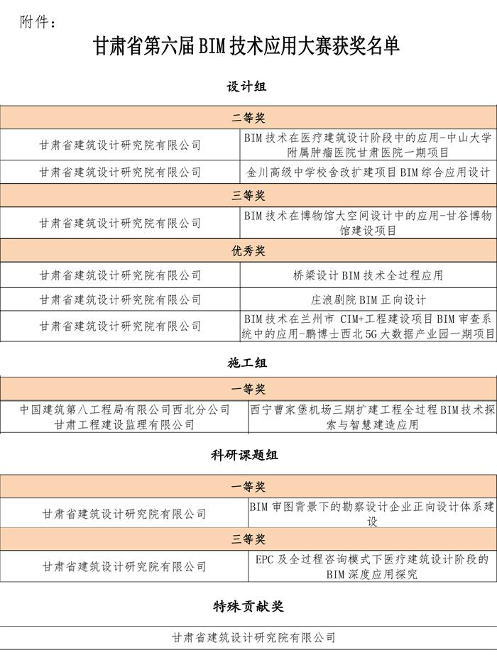 克日,甘肃省第六届BIM手艺应用大赛落下帷幕,省修建设计院选送的9项作品,经由层层筛选、答辩评审,最终在185个参赛作品中脱颖而出,并划分获奖。省修建设计院荣获特殊孝顺奖。