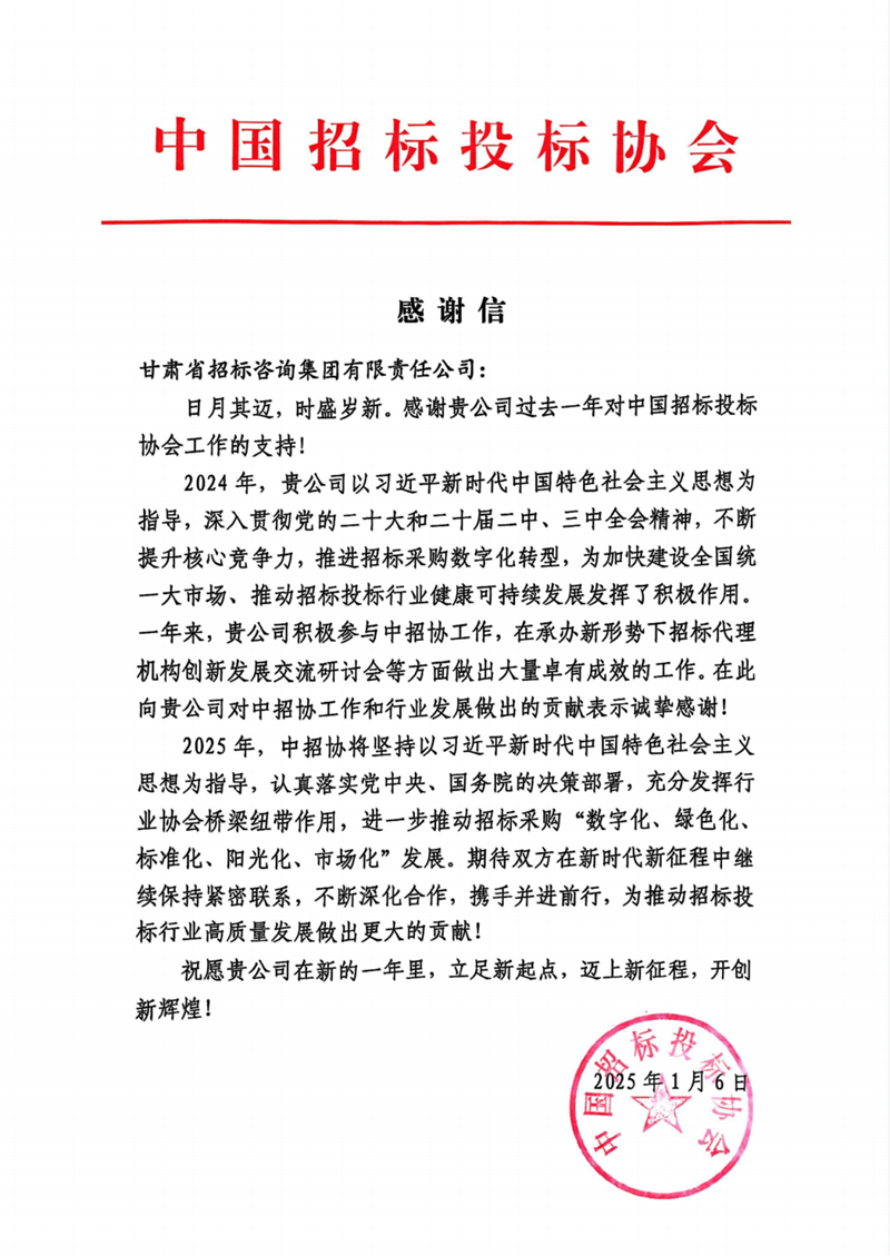 克日,省招标集团收到来自中国招标投标协会(下称“中招协”)的谢谢信,谢谢省招标集团作为中招协常务理事单位为招标投标行业生长作出的起劲孝顺。